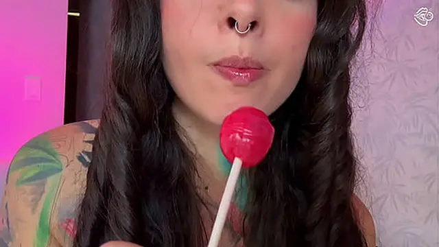 Girl with split tongue licks a lollipop and puts in ass
