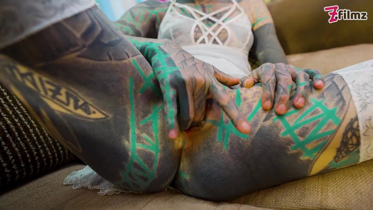 Heavily tattooed solo girl in lingerie masturbates rigid with massive dildo